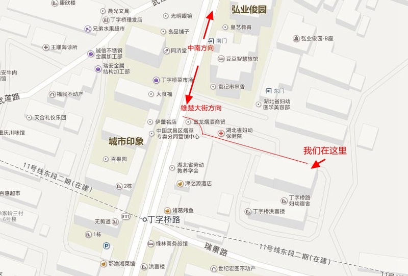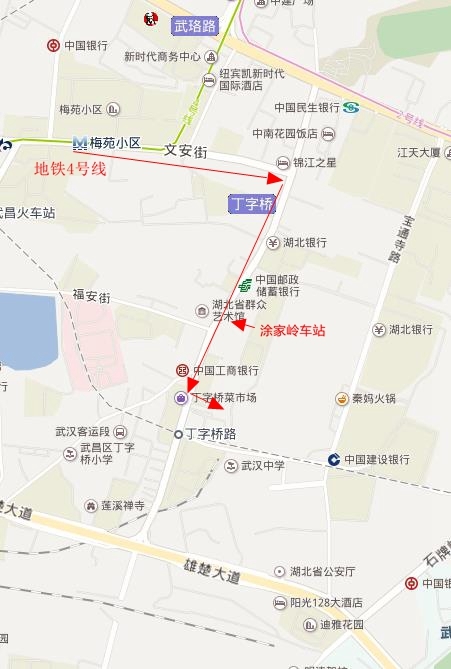 (原丁字桥门诊部,涂家岭中百仓储对面,可乘坐公交到涂家岭路站下车往雄楚大街方向步行300m左右,或做地铁2号线到梅苑站下车后往涂家岭方向步行1.5km左右)