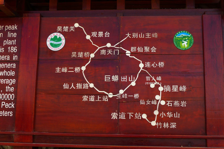 湖北境内景区地图,我们上去的时候是走索道下站(停车) →索道上站→仙人指路→吴楚桥→南天门→主峰(扎营)的线路,去安徽走的是主峰→气象站(没有在地图上)→吴楚关进安徽景区,从安徽回来走得是吴楚关→观景台→南天门(扎营)→群仙聚会→哲人峰→小华山→竹林深→索道下站(取车)