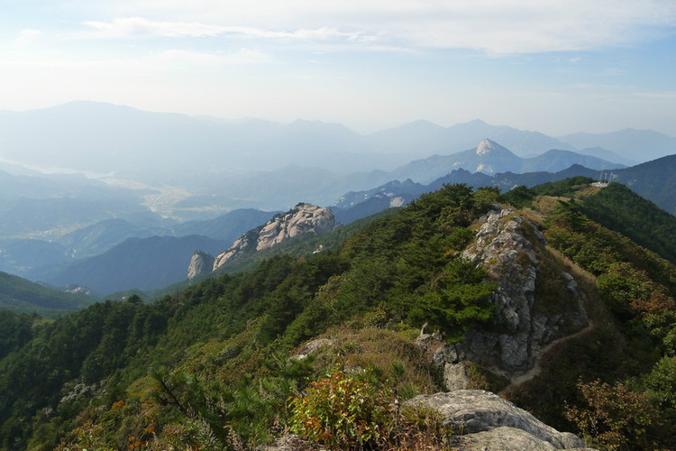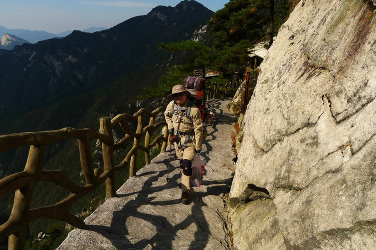 十月一日早餐过后整理行装,检查物品齐备后已经是上午9点多了,赶紧向着安徽景区出发,第一个目标气象站,到了气象站才看得到下去吴楚关的路。有句老话叫上山容易下山难,这次是真的体会了,昨天上来的路又陡又窄,下去的时候好些地方都是屁股贴着岩壁下的,一番艰辛总算到达了气象站。往下一看,没多远就是吴楚关了,再一看路又是难走的路,好些地方要走到跟前才能看到继续的道路。下去的时候还不小心踩到一块松动的石头上把脚崴了一下,还好鞋帮高保护住了,只是疼了有一会但没有伤到,不然后面的路就惨咯。