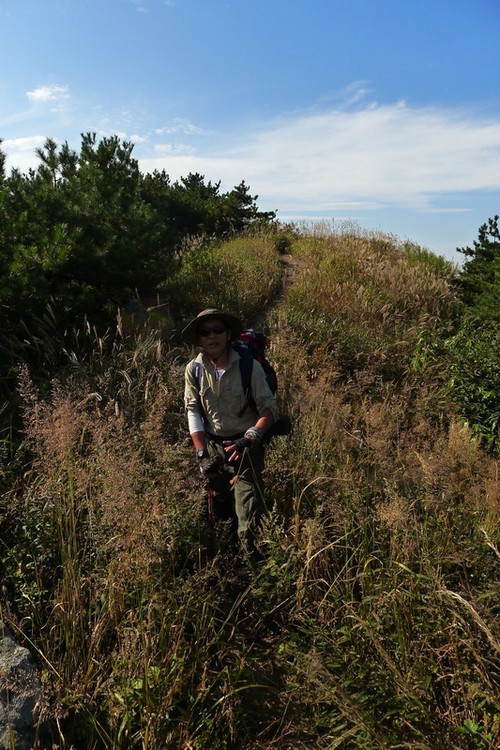 ↓ 马上要登顶冲刺了,接下来的路更艰难,到处杂草丛生,有时都分不出路来,只能是用登山杖拨开草从继续行走。