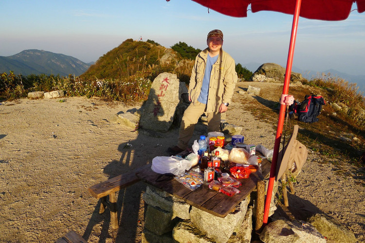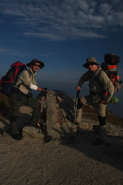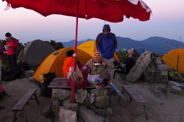 ↓ 终于艰难的上到山顶了,大家合个影就开始准备晚饭和扎营了。峰顶上有看山人卖饮料副食的太阳伞和台子,刚好可以用,满佩服他们每天都上山下山,还要挑东西。