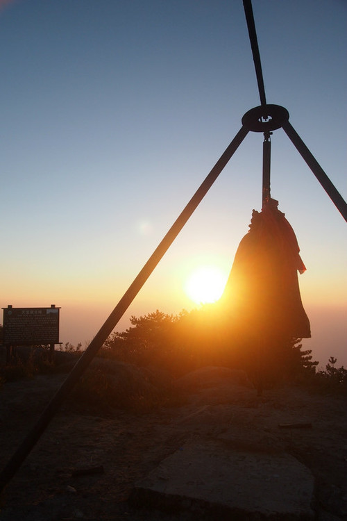↓ 十一清晨的金色阳光照耀着大别山主峰顶上的大钟。回头看我们的营地也沐浴在金色的阳光中。