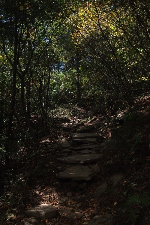 ↓ 第一天的路程基本是一路向上,第二天上午的路程就是一路向下了,我们没有选择走烽火台那条有栈道的路,而是走的山间小道。