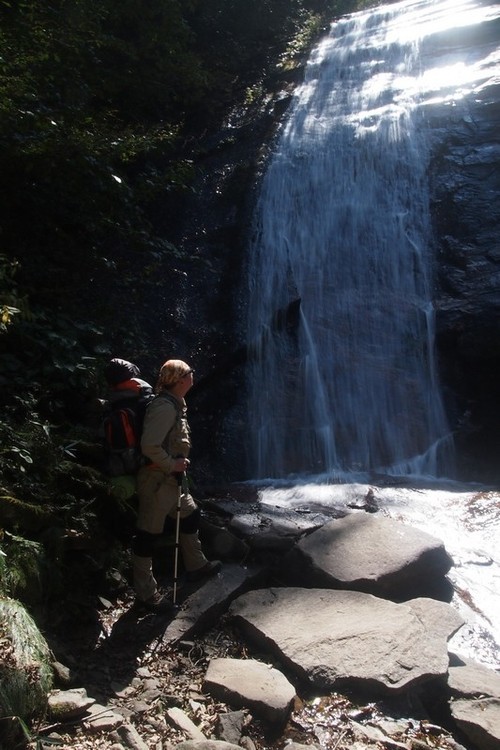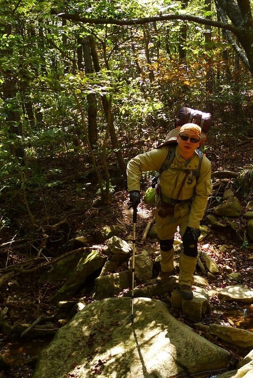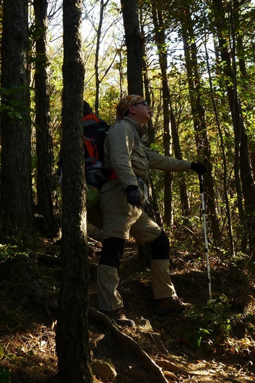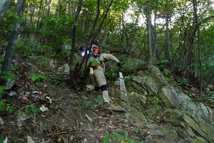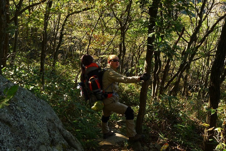 这段路很陡,背着沉重的行李只好贴着岩石上,免得重心不稳栽下去可不得了。