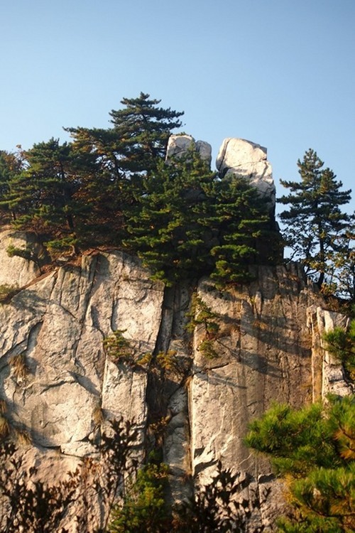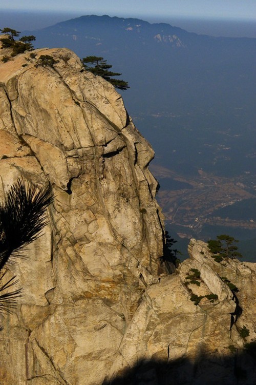 ↓ 吃过早饭收拾行装,开始我们的下山路,询问过一早上山的本地人知道往小华山的栈道基本是废弃了,只有走山间步道,从南天门下山差不多5-6公里路,走到哲人峰又忍不住拍了两张。