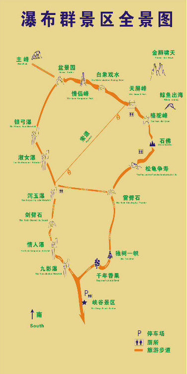 ↓ 看看地图研究下接下来要走得路线,原计划从吴楚关向右走山间步道往银弓瀑→淑女瀑→泻玉瀑方向进入峡谷景区,后来到泻玉瀑后问景区管理人员好像安徽景区现在不让露营,只好改为走银弓瀑→淑女瀑→泻玉瀑→索道→天屏峰→情侣峰→吴楚关→回南天门扎营了。