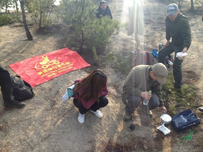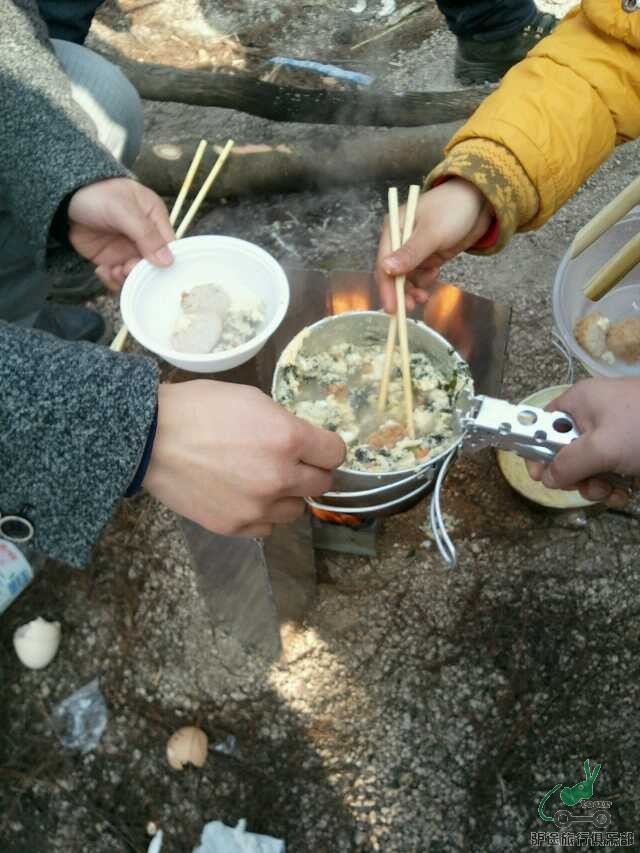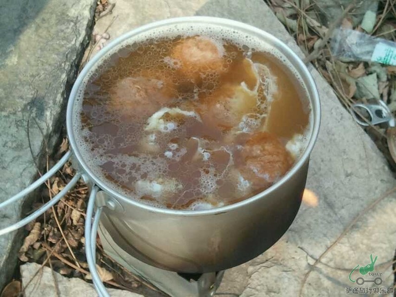 不知不觉,到了午饭的时间,大家都把自己带的干粮面包和蛋糕,饼干馒头拿出来简单应付的,特别整齐的,集中的等待西罗童鞋带的美食火锅,其中还有闪存大哥倾情奉献的肉丸子,经过西罗和维维豆奶的配合,弄了一顿原生态的紫菜蛋花肉丸子火锅,我们则一个个馋猫似的,流着口水,拿着碗,围着锅等着开吃,现在想想那个味道美极了,女儿更是一个小馋猫,围着锅碗团团转,拉都拉不走啊,大家你一口我一口,快速的消灭干净了,估计带食物的主人都没有吃好。在这里说声,不好意思啊,呵呵,我下次一定带肉丸子加工的,大家吃完饭很自觉的捡起不可降解的垃圾继续前行。