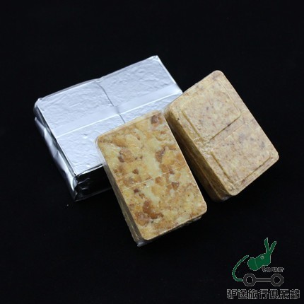 09军用压缩干粮460(比90少油,干,没90香,但不会腻),做早餐、路餐都合适,主要用来应急。能量棒基本上就是包了一层巧克力的压缩饼干。饼干容易碎,最后都在吃饼干屑。